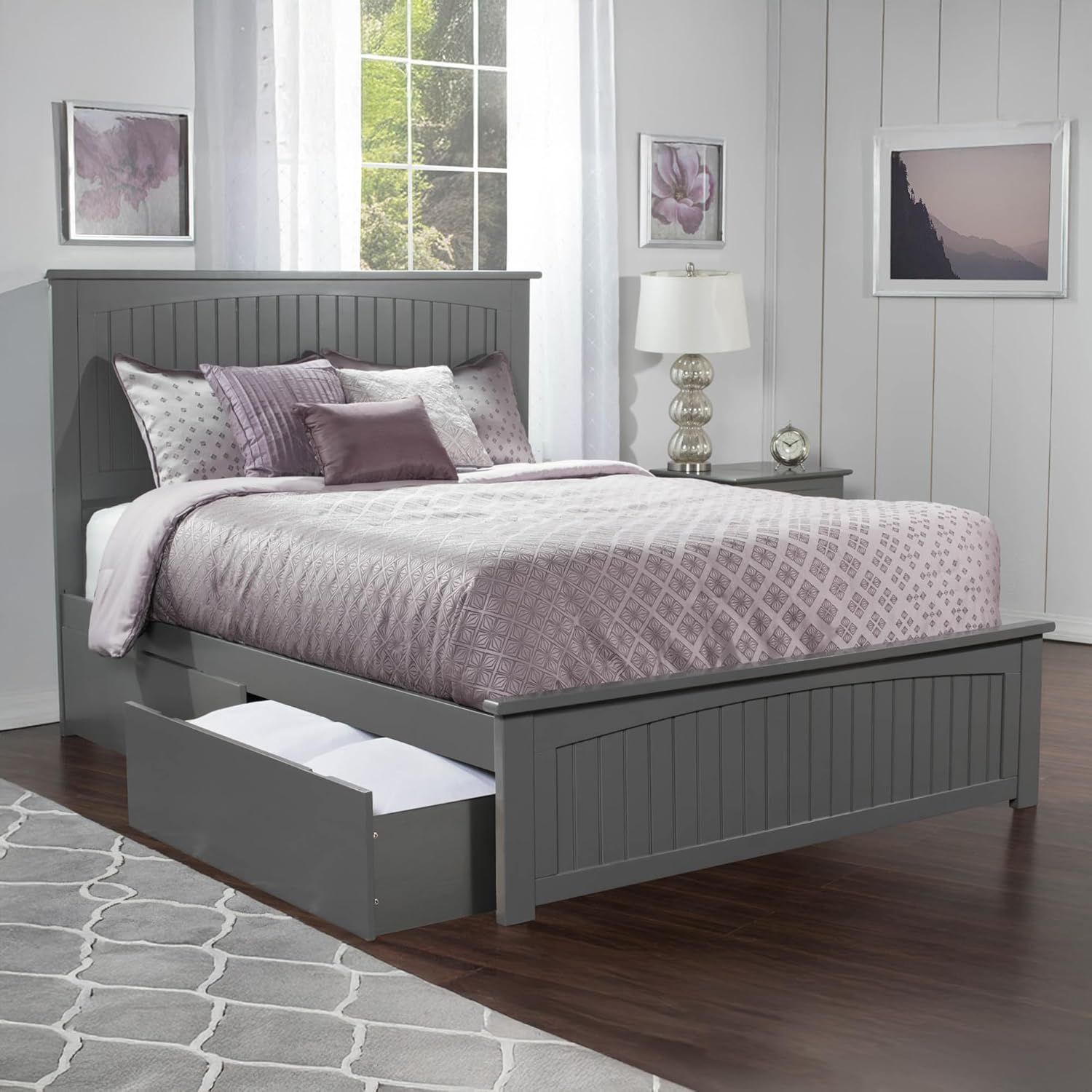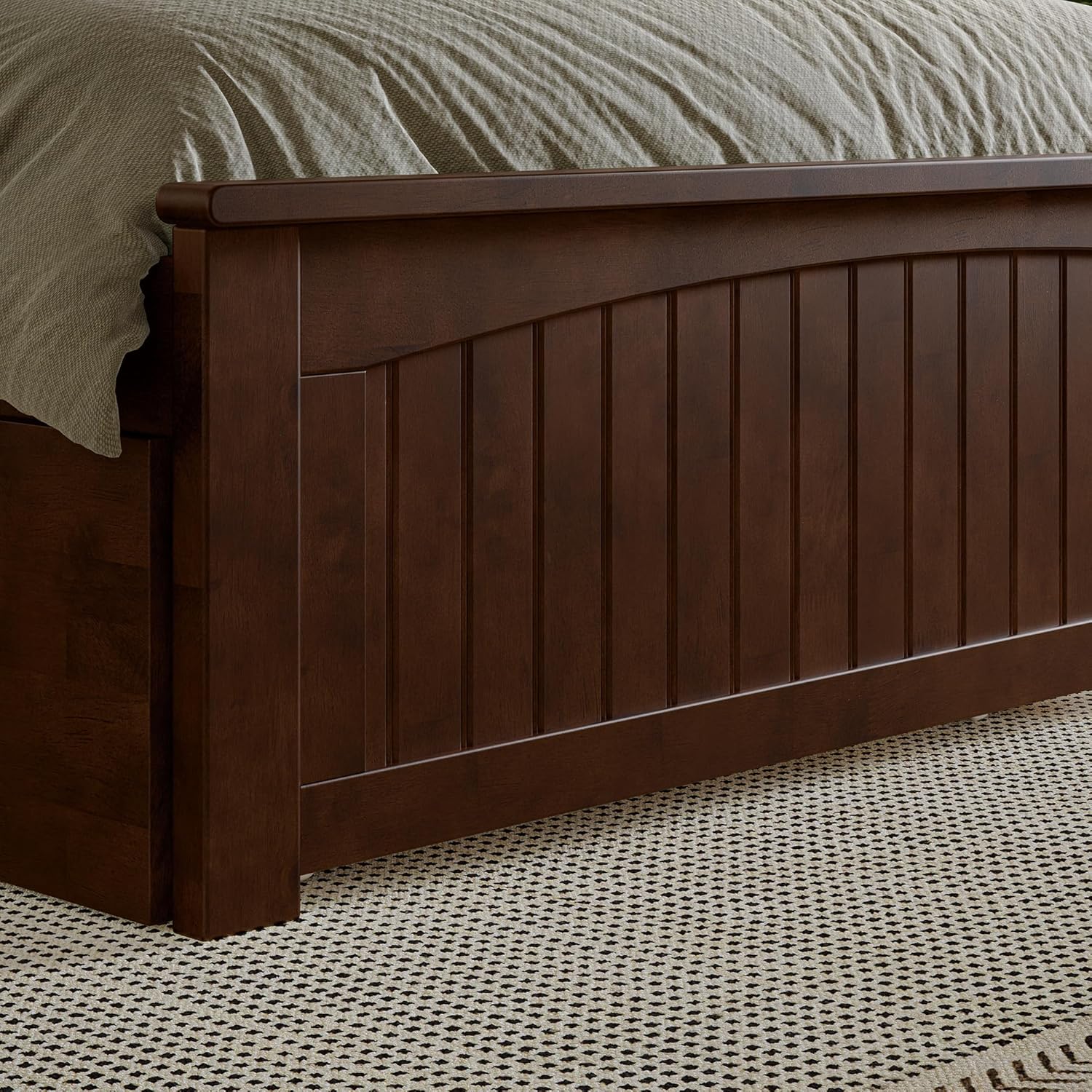 Whether you're dreaming of a seaside escape or a serene mountain retreat, the Nantucket Solid Wood Platform Bed with Matching Footboard and Set of 2 Storage Drawers is your ticket to transforming your bedroom style. With its captivating, grooved panel detailing in the headboard, this bed promises to be the centerpiece of any bedroom design. Choose from stunning finishes of Espresso, White, Walnut, Grey, or Light Toffee to best complement your existing décor. Available in various sizes, including Twin XL, Twin, Full, Queen, and King, the Nantucket caters to your space effortlessly. Crafted with a reliable slat kit, it's mattress-ready without the need for a foundation or box spring. Plus, it comes complete with a set of 2 underbed storage drawers to keep your space organized and clutter-free. As a bonus, we've included a surface mount turbo charger, so all your electronics can stay charged and ready for action!
