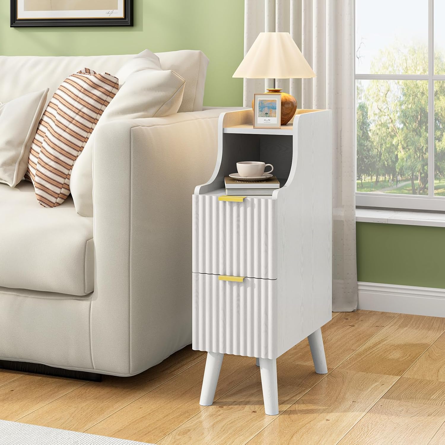 Upgrade your living room or bedroom with the BREEZEHEAT 7.9 Narrow Nightstand—is designed for modern living where space is key. Its space-saving silhouette fits perfectly in tight spots next to your bed or sofa. Built with durable engineered wood and chunky tapered legs, it's solid, stable, and made to last. You'll appreciate the thoughtful touches: drawers that open on whisper-quiet wood glides and a top with a safety lip to keep things in place. It keeps your area tidy with two spacious drawers for hiding clutter and an open space for books or baskets. Setup is straightforward, and our team is here to help if you need it—your satisfaction is what matters.