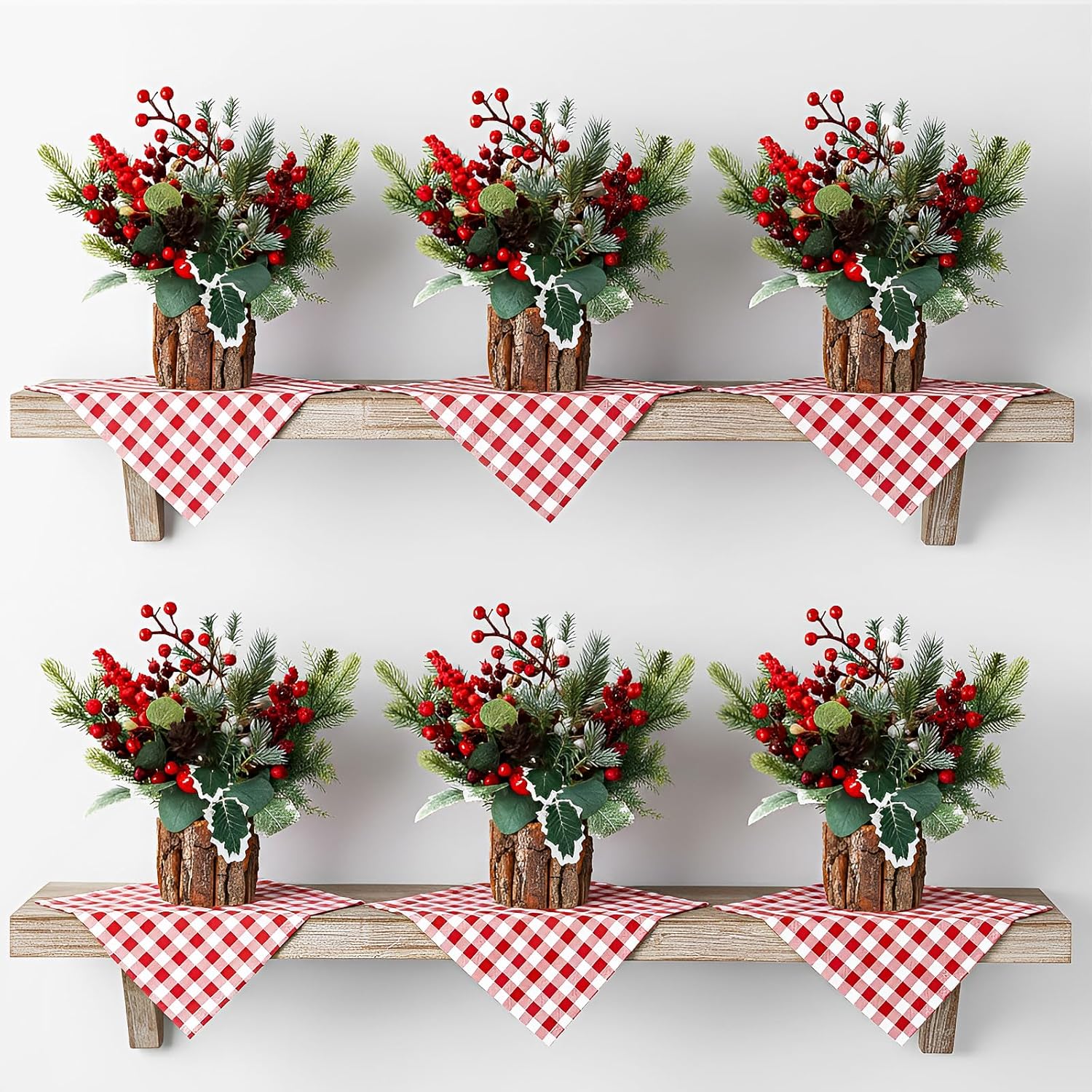 Features: The Christmas centerpiece designs showcase authentic details with real bark containers and lifelike frosted foliage. The natural-inspired elements bring wintry charm to your holiday decor while maintaining their beauty throughout the season. These Christmas tree centerpieces for tables work beautifully in various settings beyond dining tables - perfect for mantels, entryways, offices or hotel lobbies. The natural winter theme complements both Christmas and general seasonal decorations throughout the holiday period. Specifications: Material: Plastic, wood Color: Green, red, white Size: Bark containers about 3.54 x 3.15 inches Floral Clay about 2.36 x 1.57 inches Frosted branches about 12.8 inches Holly strands about 7.8 inches Berry stems about 5.9 inches Pinecones about 1.8 inches Package includes: 6 X bark buckets 6 X Floral Clay 48 X Frosted branches 6 X Holly strands 12 X Berry stems 12 X Pinecones Notes: Manual measurement, please allow slight errors on size. The color may exist a slight difference due to different screen displays
