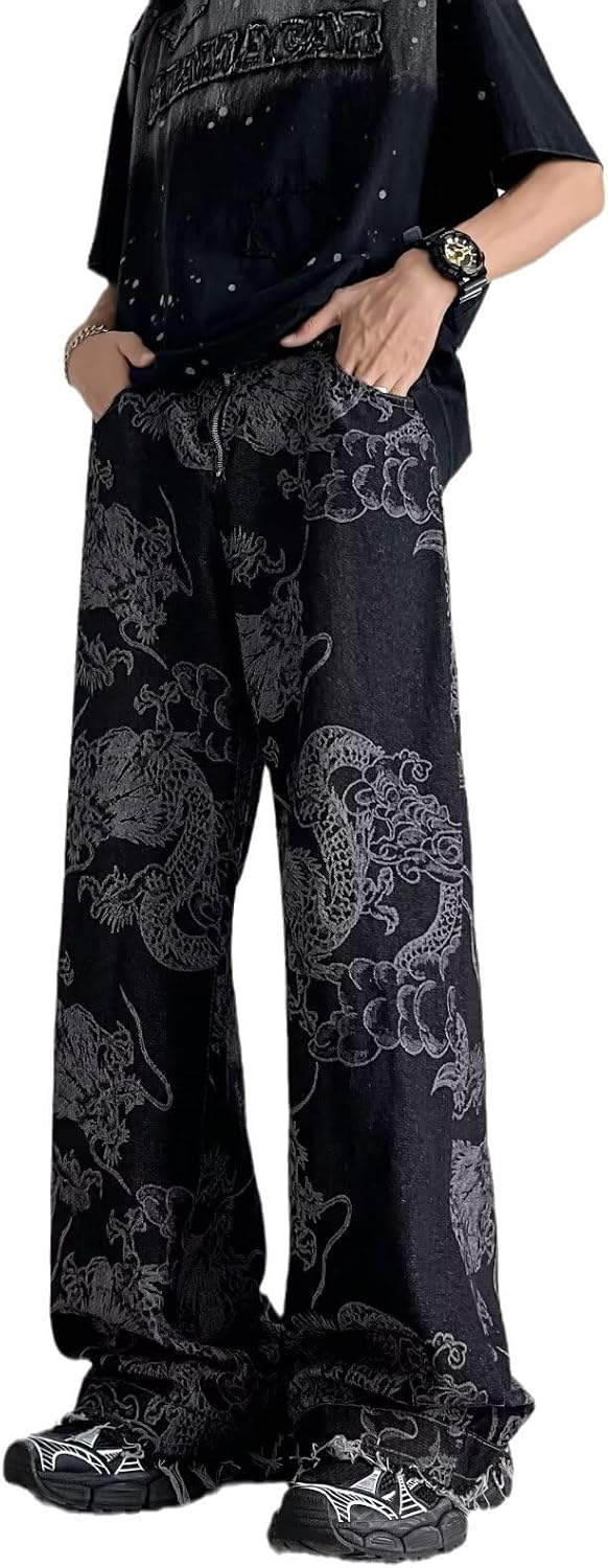 These Y2K baggy jeans bring bold streetwear style to your wardrobe with their eye-catching dragon print design. The vintage-inspired aesthetic features intricate dragon graphics throughout the denim fabric, creating a statement piece that captures the essence of punk and gothic fashion. Designed with a relaxed, wide-leg fit, these distressed jeans offer maximum comfort and freedom of movement while maintaining that coveted oversized silhouette. The raw, frayed waistband adds an edgy touch that complements the overall vintage vibe. Perfect for both men and women who embrace alternative fashion, these pants pair effortlessly with crop tops, oversized tees, or graphic hoodies. The versatile dark wash makes them suitable for various occasions, from casual hangouts to concerts and creative events. Whether you're building a hip hop inspired outfit or channeling gothic streetwear energy, these dragon print jeans deliver authentic Y2K style with a contemporary twist. The baggy cut allows for easy styling with chunky sneakers or platform shoes to complete your look.