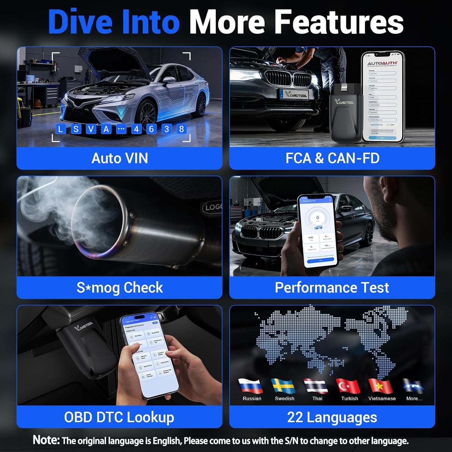 • 〖Lifetime Free Updates & Wide Compatibility〗Your investment is protected. VDIAGTOOL D100 diagnostic scanner supports lifetime free software updates, continuously expanding its vehicle coverage and adding new features to keep pace with automotive technology. It features specialized support for FCA brands (for Jeep, Chrysler, etc.) and the modern CAN FD protocol, ensuring compatibility with vehicles from 2019 onward. This Bluetooth OBD2 scanner is your trusted long-term car diagnostic tool.Note:FCA AutoAuth subscription is not included and must be purchased separately via the official FCA website.