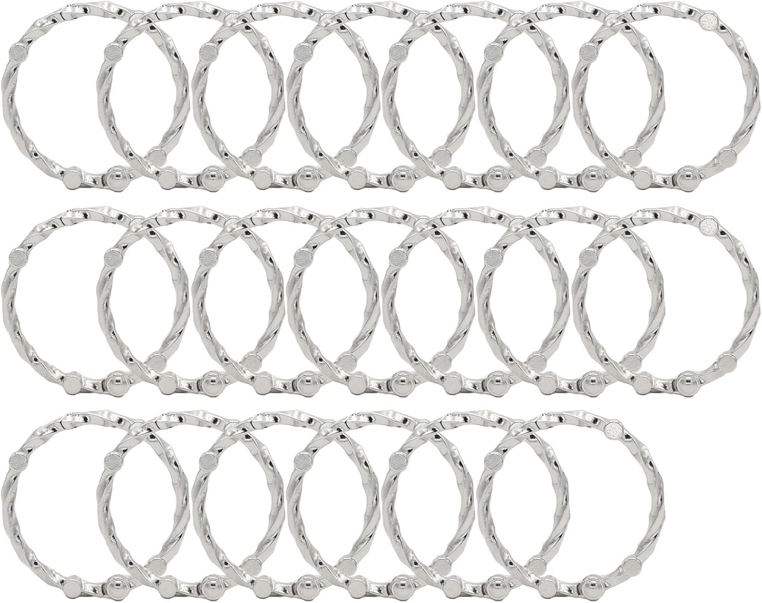 Rustproof your bathroom with Rustproof Decorative Shower Curtain Rings. They are Guaranteed for Life not to rust! Don't let your shower curtain be the only thing that makes your bathroom look beautiful. Use this set of 20 rings with your new shower curtain or combine them with a shower rod and shower caddy for a rust proof bathroom. Available in chrome, bonze or nickel finishes, they look great, complement just about any bathroom decor and work with any standard shower rod. Installation is easy: the rings clasp closed to ensure liners and curtains remain on the rod. Shower Curtain Rings Hooks for Bathroom Curtains RodsMatch Any Shower Curtain/ LinerMade of 100% MetalHighly rustproof for lastingSnap clasp closure design. Easy to installEnvironmental protection plating for good lookFashionable ring patternFit most of shower curtain rodsVersatile usage: can be used as shower rings, large binder rings, Key rings, organizing tools etc.Suitable for bathroom, bedroom, garage, living roomSpecification:Material: Zinc AlloySmooth GlidingGlide smoothly and fast across shower rodAdjustable HingeAdjustable hinge can open up to 135 degree